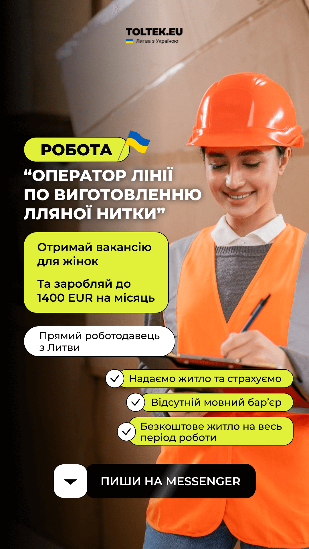Можливість за бажанням працювати понаднормово та збільшувати зарплату. Середній заробіток 1480-1650 EUR /міс.